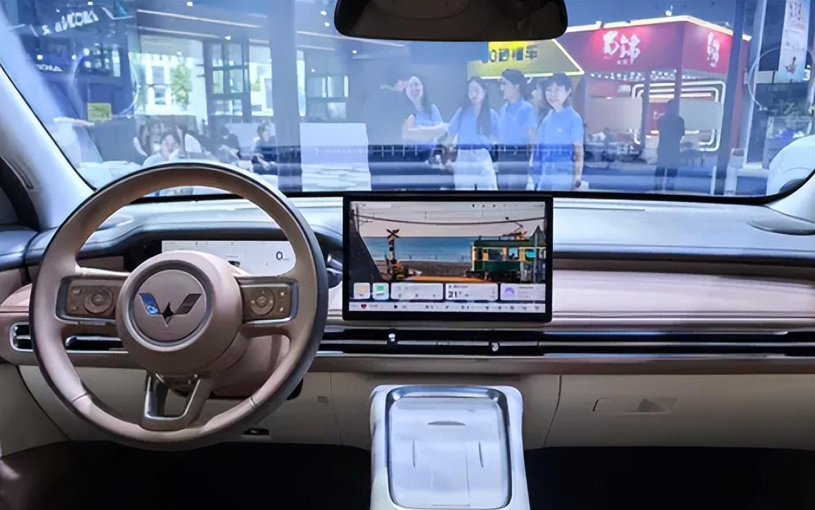 方向盘是三辐的,仪表盘8.88英寸,中控屏12.8英寸,悬浮的。现在都流行这个调调,五菱也跟上了。
