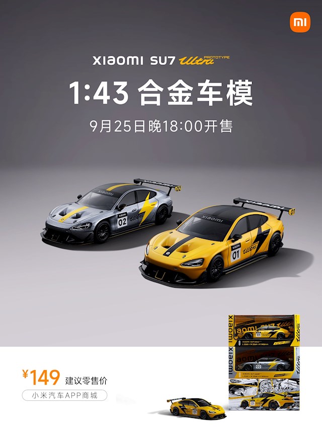 快科技9月23日消息,小米汽车最新推出了SU7 Ultra原型车1:43合金车模,共有闪电黄和太空银两款配色,售价149元,将于9月25日18:00开售。