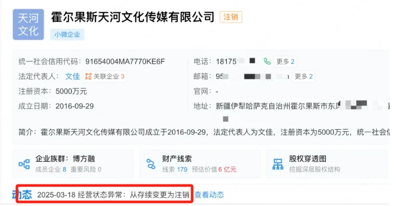 据公开资料显示,银河酷娱旗下核心子公司“天河文化传媒”,正在注销中。