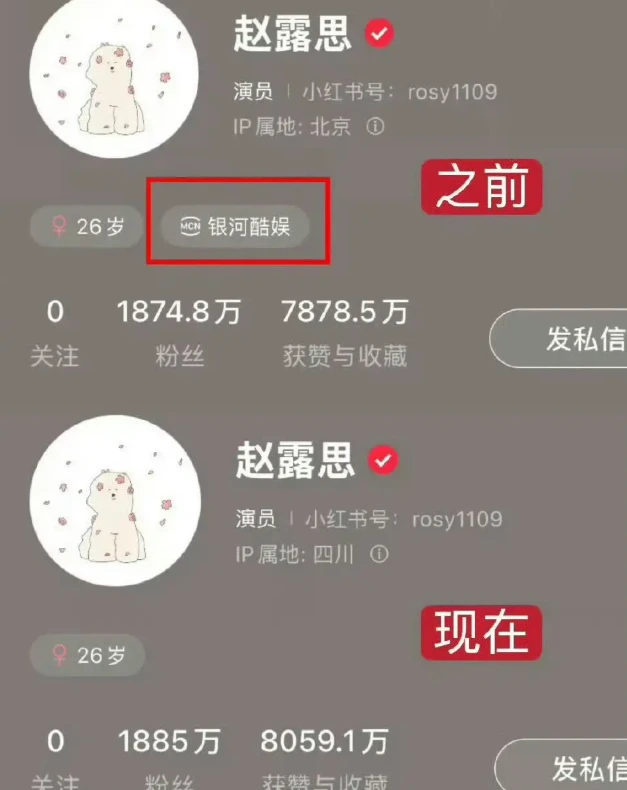 点开赵露思的某书主页,那个熟悉的“银河酷娱”MCN标识已经消失。